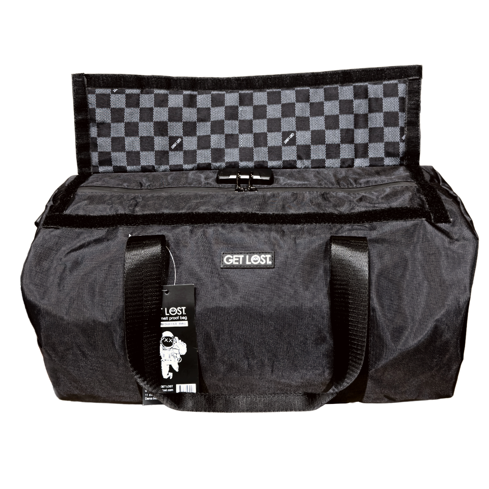 - Crafted in classic black, the Get Lost Smell-Proof Duffle Bag boasts a formidable 5-layer construction that ensures your items stay safe, secure, and odor-free throughout your journeys. The first line of defense is its water-resistant exterior, providing an additional shield against the elements. Whether you're caught in an unexpected rain shower or navigating a damp environment, your possessions remain unscathed.