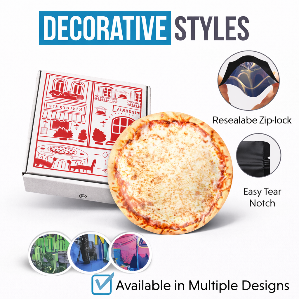 This bundle includes 12 pizza shaped Mylar bags paired with 12 matching pizza-style display boxes, creating a complete packaging setup that is ready for retail, product bundles, or stash organization. The pizza-themed artwork and unique round shape deliver strong shelf appeal and a premium presentation.